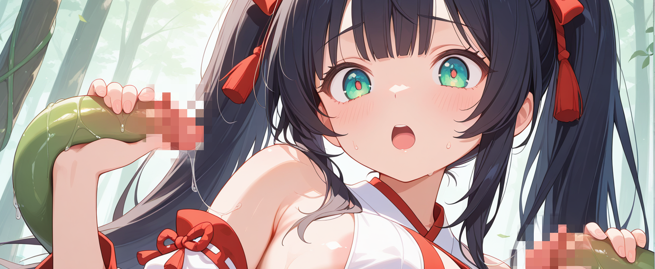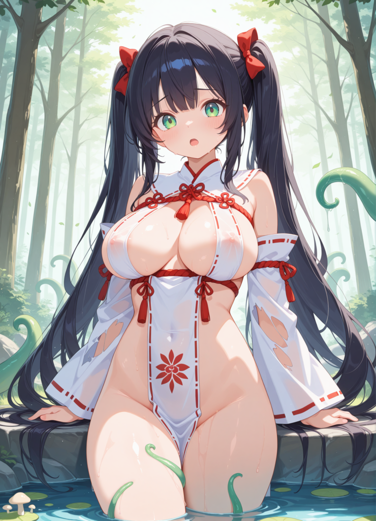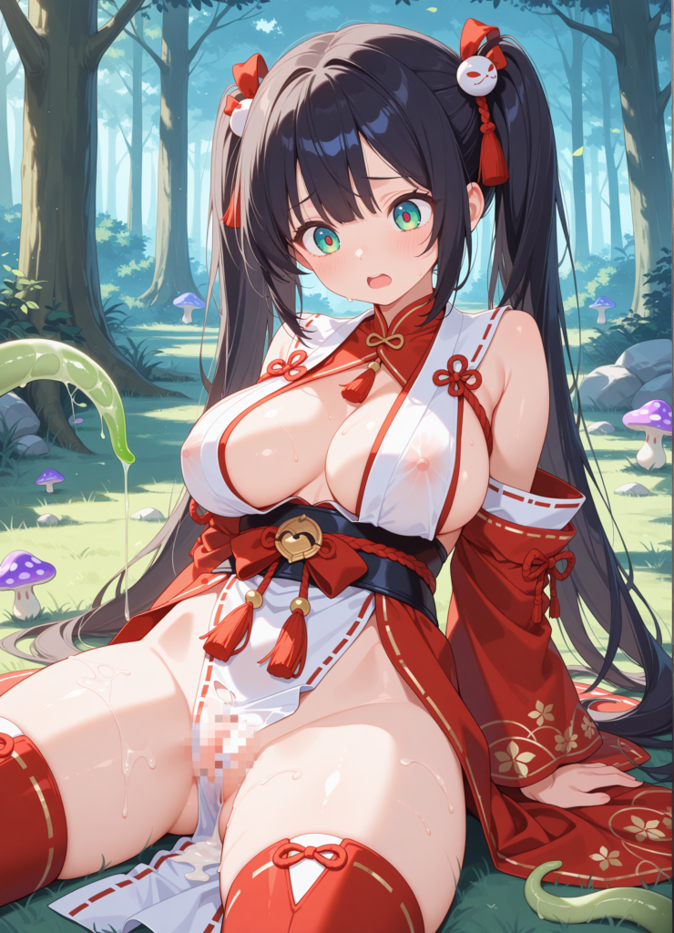 1girl, beautiful, anime, long straight black hair with bangs, deep violet eyes filled with shame, slender frame, large breasts, porcelain skin with red welts, moaning in distress, wearing a torn red and white miko outfit with ripped sleeves and exposed thighs, entangled by slimy green tentacles in a misty forest with twisted trees and glowing mushrooms, tentacles penetrating her, fluids leaking, detailed anatomy with glistening skin, high resolution, soft green fog light casting an otherworldly glow, medium shot from a side angle showing her struggle, nsfw