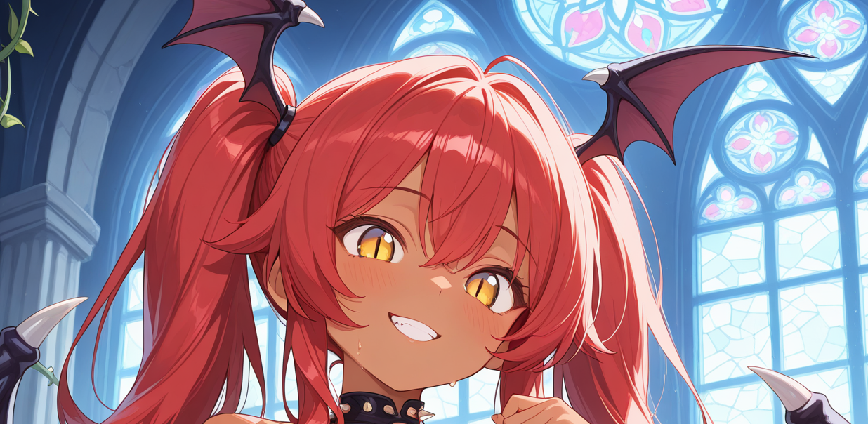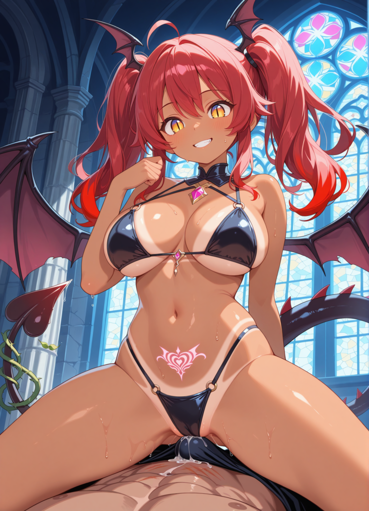 1girl, 1boy, alluring, anime, long red hair flowing wildly with glowing tips, golden eyes with slit pupils, curvy figure, large breasts, tanned skin with shimmering sweat, grinning wickedly, wearing a barely-there leather bikini with bat wings and a spiked tail, straddling a man in a crumbling abandoned church with broken stained glass and vines, riding him in cowgirl position, dripping fluids, detailed anatomy with claw marks, high resolution, eerie moonlight streaming through gaps, full-body shot from a low angle emphasizing her dominance, nsfw